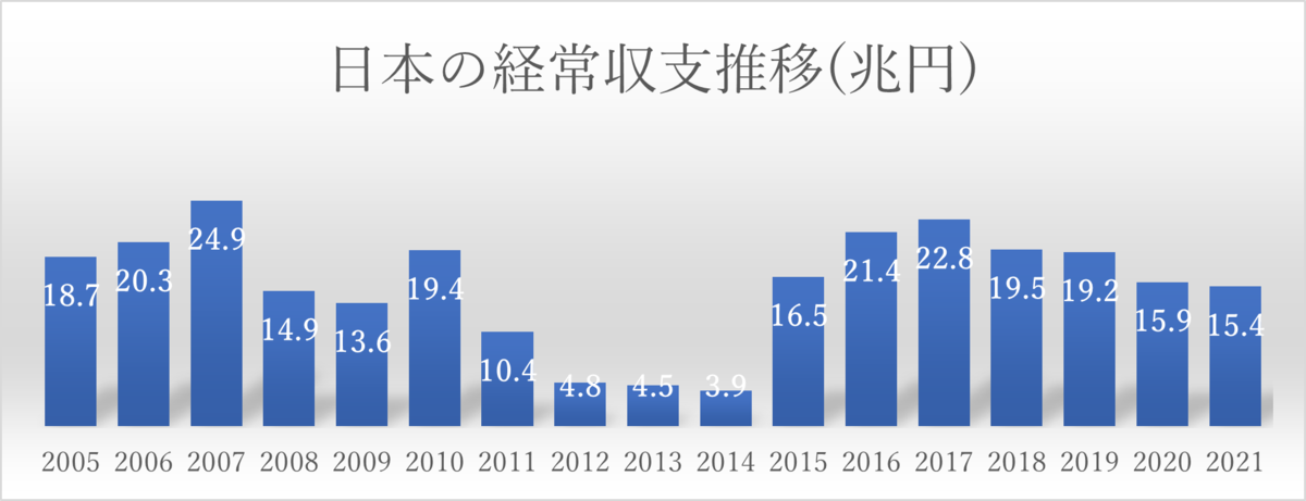 しかしながら、経常収支を見た時には日本は2021年中15兆4,359億円の黒字であることがわかる。この原因はひとえに日本の第一次所得収支の20兆3811億円の黒字である。